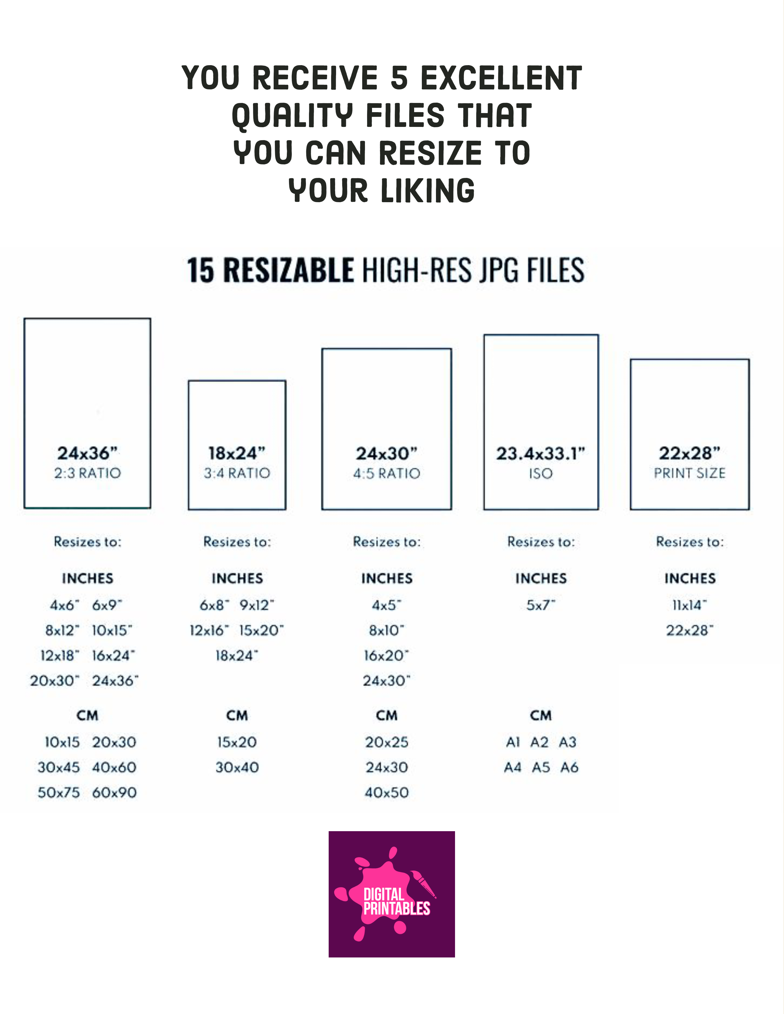 This is a digital product, we deliver 5 high quality images in JPG format to print.